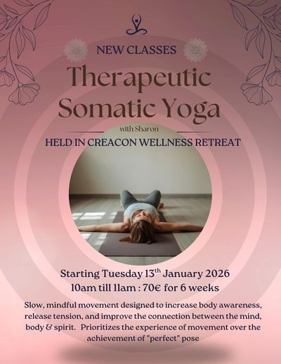 Delighted to announce that in the new year i will be offering Therapeutic Somatic Yoga in Creacon Wellness Retreat, New Ross, Co. Wexford, starting on Tuesday 13th January 26. 10am till 11am.